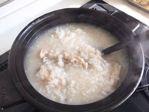 数日前から風邪をひいているくまさんのためにお粥を炊きました。 お粥と言ってもベトナム風お粥「チャオガー」です。 土鍋にジャスミン米、水、顆粒鶏がらスープ、鶏の手羽中を入れて蓋をして弱火でフツフツ… 焦げ付かないように時々混ぜ、水も追加します。 …