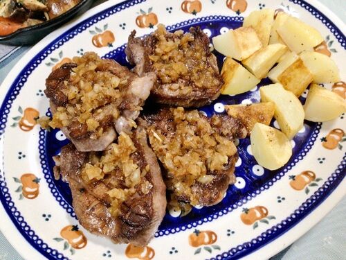 メインは厚切り牛タンステーキです。 格子に切り込みを入れて塩胡椒した牛タンを両面焼いて、アルミホイルに包んで10分保温しました。 肉を出したあと玉ねぎのみじん切りを炒め、醤油、みりん、水を加えて煮詰めたオニオンソースをかけました。 付け合わせは…